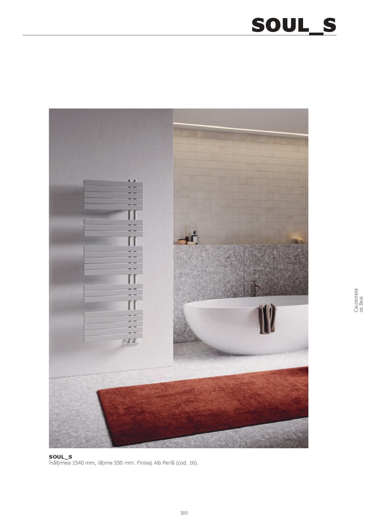Ușoară, minimală și esențială, SOUL_S reinterpretează orice mediu inconjurator. Perspectivele sale liniare sunt expresia evoluție, întâlnire fascinantă între o rundă colector și un profil plat, capabil să influențeze și caracterizează îmbunătățirea mediului în baie personalitatea acestuia. Disponibil în 3 înălțimi și 1 lățime. Odată cu introducerea rezistenței electrice (opțional) acesta poate funcționa chiar și în perioadele în care sistemul este oprit.