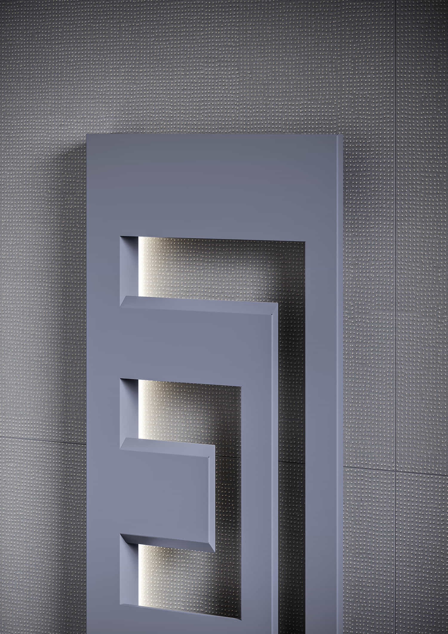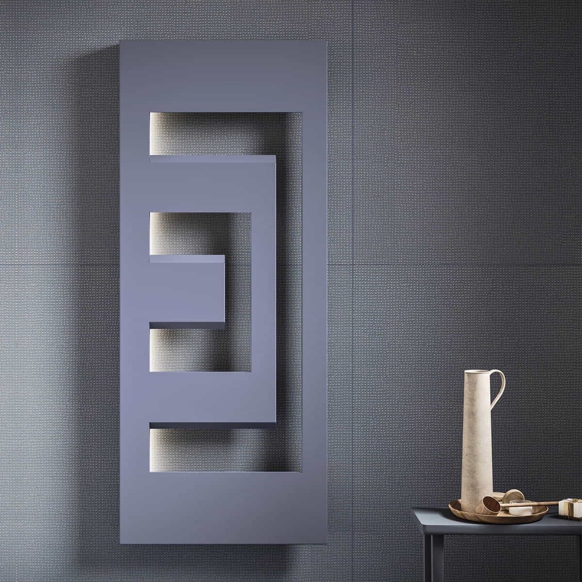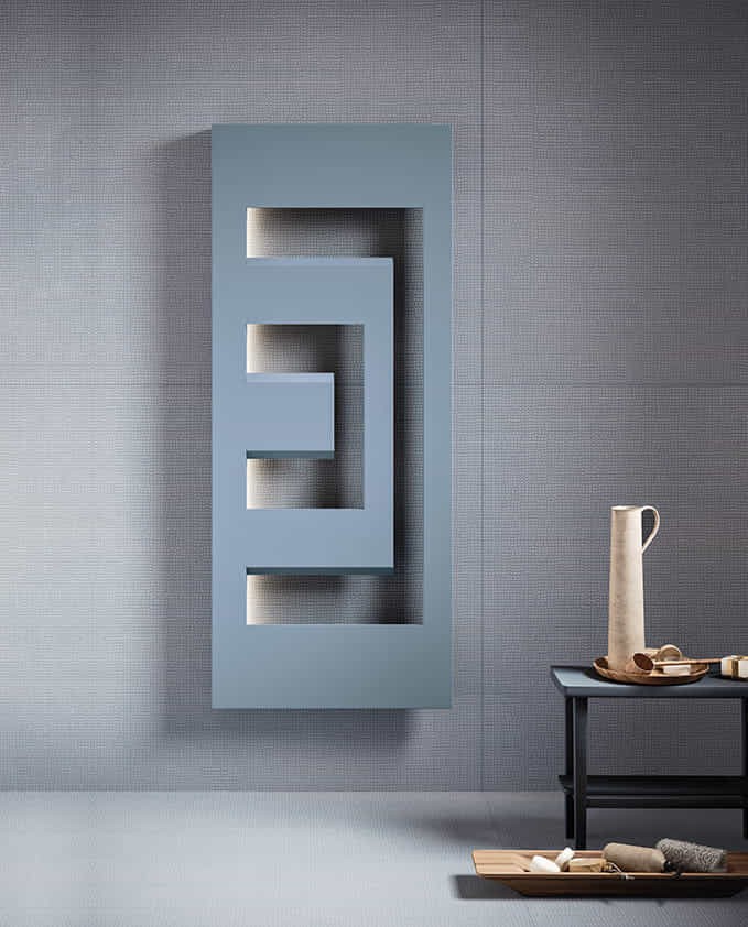 Jocul volumetric de plinuri şi goluri pune în relief caloriferul DEDALO pe fundalul peretelui. Sursa ascunsă de lumină detaşează radiatorul de suprafaţa de sprijin făcându-l să pară suspendat şi facilitând în acelaşi timp aranjarea prosoapelor. Funcţia de portprosop îi este intrinsecă formei obiectului fără, însă, a-i condiţiona utilizarea. Partea hidraulică şi robinetele sunt ascunse vederii, fiind integrate în unicul element de fixare pe perete. Suprafaţa se descompune în numeroase feţe de forme clasice cărora iluminatul le conferă preţiozitate şi stil. Lumina cade diferit pe feţele obiectului, permiţând o percepţie diversă a acestora.